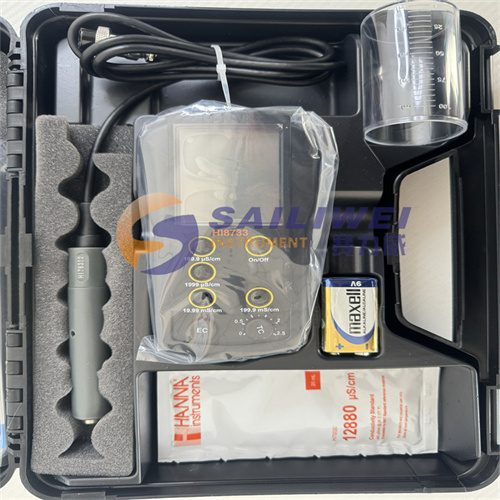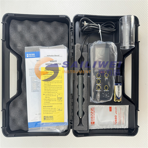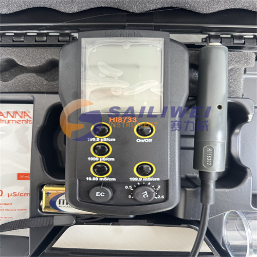 hi8733主机,hi76302w 内置温度传感器的四环电导率-ec电极,电导率标准缓冲液(标准值@25°c:12880 μs/cm ,规格:20ml),中英文使用说明书,hi721015 定制专用仪器包装盒